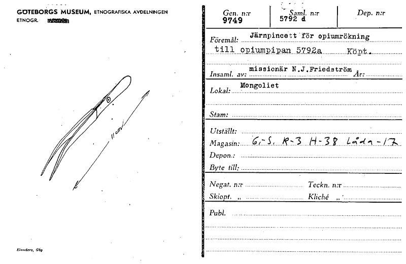 • GOTEBORGS MUSEUM, ETNOGRAFISKA AVDELNINGEN ETNOGR. 11~ Gen. n:r 9749 ISaml. n:r 5792 cl Dep. n:r Föremål: Järnpincett'för opiumrökning till opiumpipan 5792, K.ö.Dt.. missionär N.J.Friedström Insaml. a... Visa hela