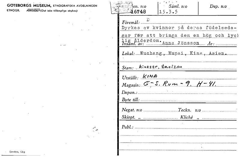 GOTEBORGS MUSEUM, ETNOGRAFISKA AVDELNINGEN ETNOGR. 1(Det icke tillämpliga strykes) 1 Elanders, Gbg .1 'en. n:o • 6748 ' Sån!. n:o 15.3.5 Dep. n:o . D Föremål: Dyrkas av kvinnor på deras födelseda- ger för att bringa dem en hög och lyc hg ålderdom. InsamLav: I Ann- Jönsson Ar: Lokal: W.u.e.hang , Hup.e.i. ,.. Kin.? , Aale.n.. Stam: "ser, t ok-oi•s~ Utställt: k i N19- Magasin:, ^ s, /ev ka-L 9 y '/• Depon. • Byte till: Negat. n:o Teckn. mo Skiopt. „ Kliché„ . Pub!.: [ocr]