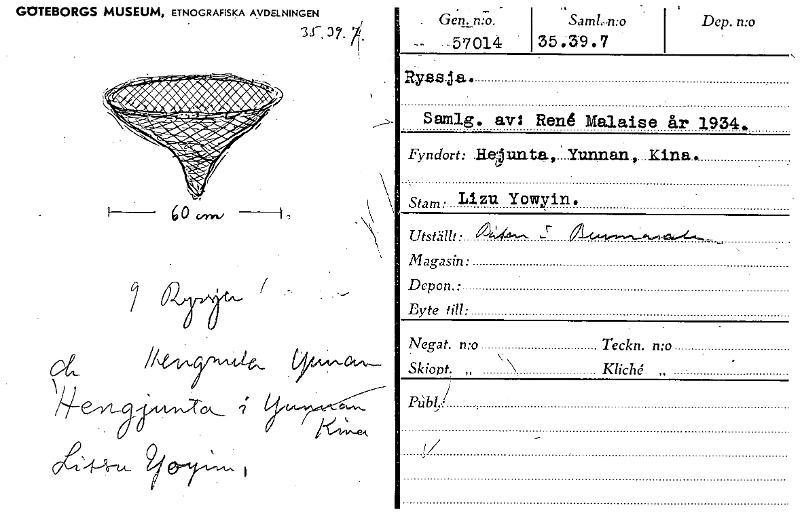 GOTEBORGS MUSEUM, ETNOGRAFISKA AVDELNINGEN - Gen. n:o. -57014 'SamL.,n:o 354.9.7 Dep. n:o y °97TA-r R3713,Eda, Samlg. av: Rend Malaise år 1934. Fyndort: .13eunta,2.Yunnan, Stam . Lizu Yowyin. Utställt • Magasin: Depon.: Byte till: Negat. n:o Teckn. mo „ Skiont. „ Kliché 1/ [ocr]
