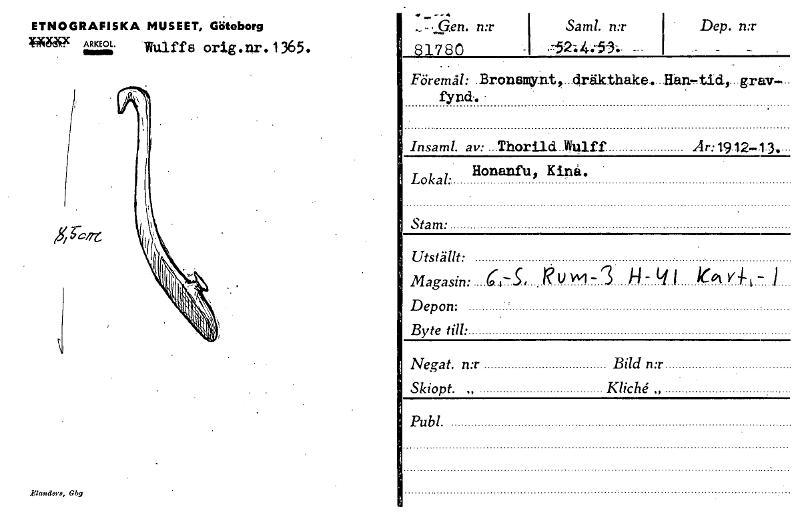 -•Gen. n:r 81780 Sam!. n:r .75214:53: ETNOGRAFISKA MUSEET, Göteborg 214~ ~MLffs orig.nr.1365. Föremål: Bronamy.n.t dräkthake FLan,tid, grav- - fynd.. Insaml. av: ...Thorild. Mulf f År: 1912-1 Honanfu...