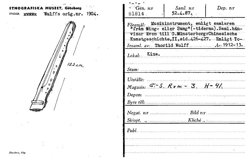 , ETNOGRAFISKA MUSEET, Göteborg ETNOGR. =nk -Wulff s orig . nr. 19(54. Dep. n:r Föremål: Musikinstrument, enligt samlaren "från- Ming- eller Sung" (-tiderna) . S aml . hän- visar även till .0 .Miins...