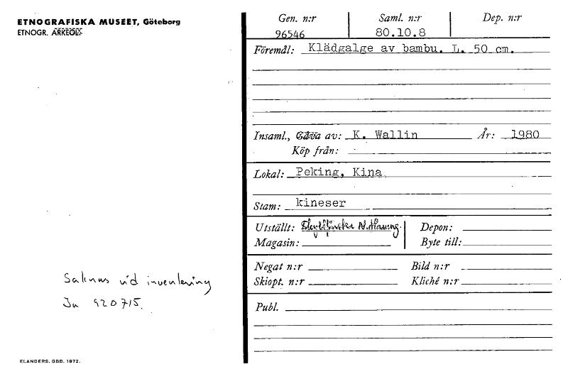 • ETNOGRAFISKA MUSEET, Göteborg ETNOGR. ARKEW (A6 ELANDERS.GBEL1972. Gen. n:r 96546 Saml. n:r i 80.10.8 i Dep. n:r Föremål: Klädgalge av bambu. L. 50 cym. Insaml, ej flå av: K. Wallin ii- • 1980 Köp frå... Visa hela