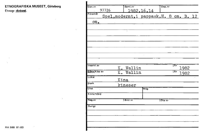 • ETNOGRAFISKA MUSEET, Göteborg Etnogr.)6gtegpi. RA 588 81,03 Gen.nr 97726 Saml.nr 1982.16.14 I r Dep.nr Föremål Spel modernt,i pappask.H. 8 cm. B. 12 cm. Insaml av 'Ar K. Wallin 1982 gilagai_Köp v K. W... Visa hela