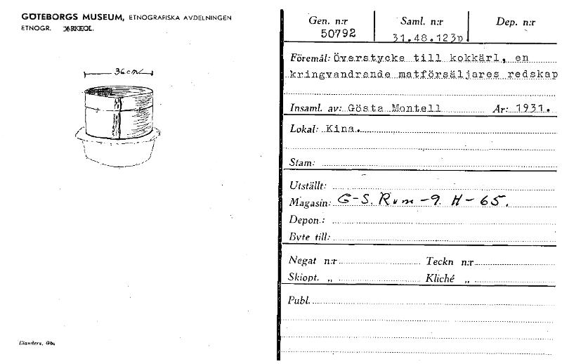 GOTEBORGS MUSEUM, ETNOGRAFISKA AVDELNINGEN ETNOGR. gKEOL. 1:1couriers, Gb4 , • Gen. n:r 50792 - Samt. n:r 31.48.123D Dep. n:r _ • Föremål: tiv.e.r.s.t.y.c.ke -till kokkärl, en ..k.r.ingvand.rands matförsäljares redskap Insaml. av:...G.ö.s.ta...Mont.ell År: 1931. . Lokal: „Kina.. • Stam: . - Utställt: . Magasin: S. 9 ii --- Depon.: . Byte till: Negat n:r Teckn n:r Skiopt. „ ... Kliché - ., Publ. .. . . [ocr]