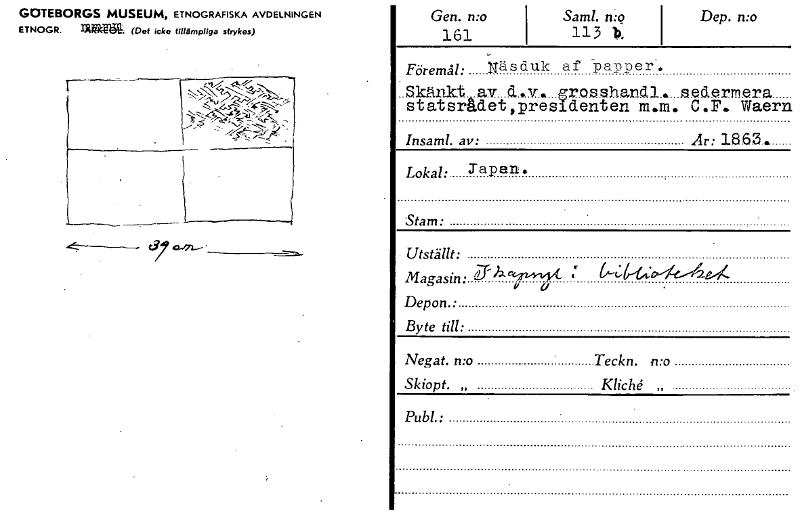 • GOTEBORGS MUSEUM, ETNOGRAFISKA AVDELNINGEN ETNOGR. liåäggi. (Det icke tillämpliga strykas) Gen. n:o 161 Sam!. n:o 113 b-, Dep. n:o Föremål: Uälsduk af -papper. Skänkt_ av d..v..grosehardl.. stateråde... Visa hela