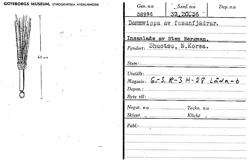 GOTEBORGS MUSEUM, ETNOGRAFISKA AVDELNINGEN _ den. n:o Saln: 589.96 3...,,,2(1";3 6 Dep. n:o Dammvippa av fasanfjadrar. Insmulacle .av Sten Beronan. Fyndort: ShuOtSu, N.Korea. Stam: Utställt • .Magasi...