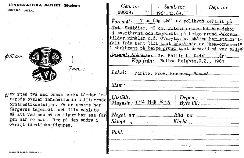 ETNOGRAFISKA MUSEET, Göteborg XxXXOAX ARKEOL I? /6/0c77,- )0 av ytan två med breda mörka bårder in " ramade ovaler innehållande stiliserade ornamentikdetaljer. På de senare har färgerna tegelrött och lila växlats så att vad som på en figur har ena fär gen har motsatt färg på den andra i övrigt identiska figuren. ELANDERS. GBG. 5687. 8. 61. Gen. n:r I 88029. . . Sam!.. n:r 1-1961.30.69.-:- I Dep. n:r i Föremål: 7 cm hög skål -.fot-. Sk-å-I-diam-. 10 cill:._ Eatensdr_e:_-del-.1&P-dekatt- aV'polikroiii keramik på av skålen har_..e.tt_mitt av "kam-ornament sant bredvid på var sida 1 ip År: tegelrött_på_beige._grun.d._kkekoren__ kant beet,ående. _L- _Padel„ i _evartbrunt. och bildar vinkiar_ o:d. fält från kant -till i mörkbrunt på beige dosairdpeninexat<x__ Köp från: Overyten- grund iir-_ Phi Balboa Heights,C.Z., 1961 Lokal: paritzl_r_ , Stam: Prov Her-rera,- . ganamå Utställt: Depon.: n-. -Magasin: T-1( HAII k -3 Byte till: Negat. n:r_ Skiopt. „ Bild n:r Kliché,, Pub!. _ [ocr]