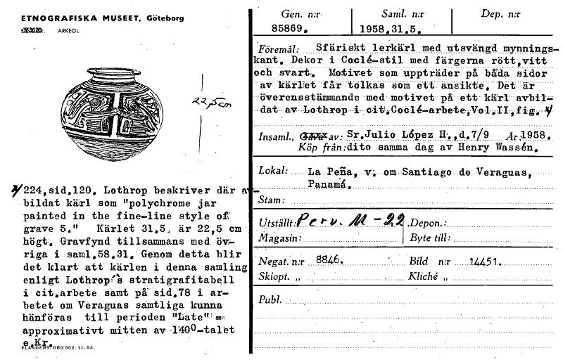 ETNOGRAFISKA MUSEET, Göteborg OfflEk. ARKEOL. 5/224,sid.120. Lothrop beskriver där a bildat kärl som "polychrome jar painted in the fine-line style of grave 5." Kärlet 31.5, är 22,5 cm högt. Gravfynd ...