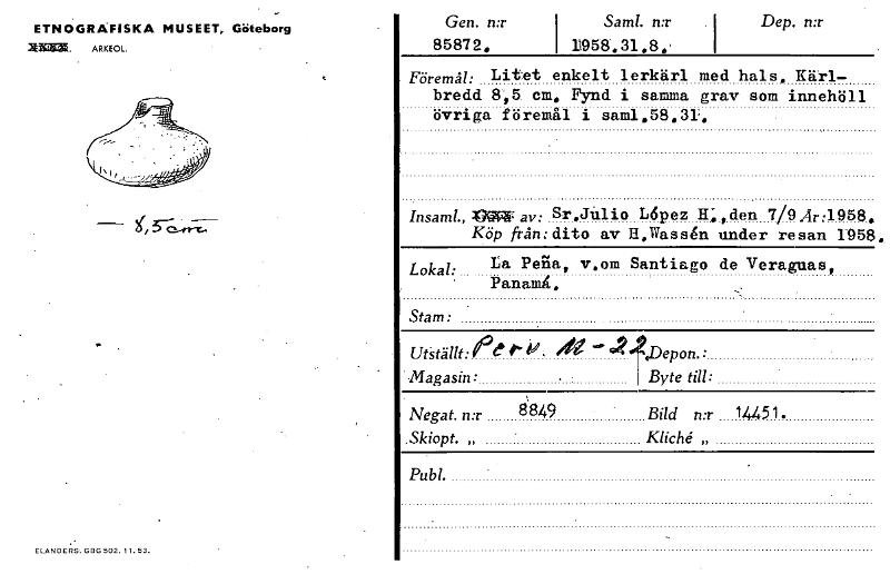 Gen. n:r I Samt. mr 85872. I 1958.31 .8 e' Dep. n:r ETNOGRÄFISKA MUSEET, Göteborg XMWW ARKEOL Föremål: Litet enkelt lerkärl med hals. Kärl- bredd 8,5 cm, Fynd i samma grav som innehöll övriga föremål i sam1.58131. Insaml., naw ay: Sr.Julio L6pez 11,den 7/9 Ar:1958. Köp från: dito av 11.Wass6n under resan 1958. Lokal: La Perla, vom Santiago de Veraguas, Panam6. Stam: ufstänt: et P- P. - •Magasin: Byte till: Negat. n:r 4849 Bild n:r 14451. ,Skiopt. „ Kliché „ Pub 1. ELANDEBS. 000 502. 11. 53. [ocr]