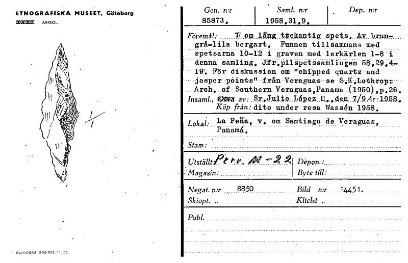 ETNOGRAFISKA MUSEET, Göteborg XX ARKEOL. ELANDERS, OBS 502. 1.53. Gen. n:r 85873, Sam!. n:r i 1958.31,9. I , Dep. n:r I Föremål: Ti cm lång ttekantig spets. Av brun- grå—lila bergart; Funnen tills...