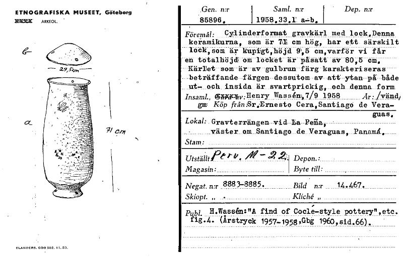 ETNOGRAFISKA MUSEET, Göteborg R= ARKEOL. ELANDER5, 050 502. 11.53. ,Gen. n:r Sam!. n:r 85896, 11958,33,1, 651. I I ' Dep.nx , Föremål: Cylinderformat gravkärl med lock,Denna keramikurna, som är 71 cm hög, har ett, särskill lock,som är kupigt,höjd 9,5 cm,varför vi får en totalhöjci. om locket är påsatt av 80,5 cm, -Kärlet—som-är-av-gulbrun-färg-karakteriseras beträffande. lärgen-cleSsutom. av Att ytan pK-bådi ut.- och insida_är_svartprickigv.och_denna_form. InsamL, gffax4v:HenrY Wass6N7/9 1958 År : /vän( gm, Köp från3r;Ernesto Cere,,Santiage de Vera- guas. Lokal: .Gravterrängen•vid-La-Pefia p • - väster ..om. Santiago. de..Veraguas, Panamå. Stam.: Utställt.re t i's. /0-2-Z1 Magasin: Depon.: Byte till: , 8883-8885. Alepg.nx Bild fur 14.467. Skiopt., . ICkhe' ” , NK H.Wassen:"A find or Cocle—.style potteryn,etc fig.4. (Årstryck 1957-1958Abk 1960,sid.66).. ' , 7/ cm [ocr]