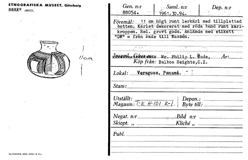 ETNOGRAFISKA MUSEET, Göteboig NROggX AMML ELANDERS. GE3G. 56E17. e. 61. Gen. n:r . . Saml ,n-r . 88054. - -I - '1961.3o: 924.. • - I -Dep. n'r Föremäl:-. ii dm. högt,- runt botten:. Kärlet- dekorerat-med lerkärl röda Anlande 1,—__tade, med. tillplattad - band runt karl- med et-M-ft, Ar: kroppen. Rel. grovt gods. "DW" = från Dade till Vassen. . , . iklyblirkixocfiåkaMoc Mr. Philip Köp från: Balboa Heights,C.Z. Lokai: Veraguas, Pang.m4. .'' : Stam:. Utställt: ____ _ Depon.: Byte till: Magasin: I- k 64101 k..- I. Negat. n:r ____ _, . ..Bild n:r Skiopt. „ KlicU „ Publ. _ ________ f [ocr]