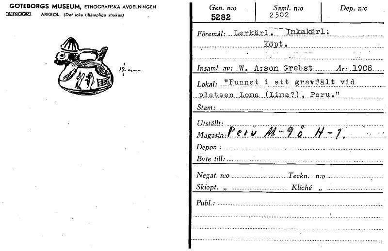 • GOTEBORGS MUSEUM, ETNOGRAFISKA AVDELNINGEN 1:~10. ARKEOL. (Det icke tillämpliga strykes) Gen. n:o 5282 Saml. n:o 2502 Dep. n:o Föremål: Lerkårl',--Inkakärl. 10.pt . Insaml. av: ..W......A.:s.on..Greb.... Visa hela