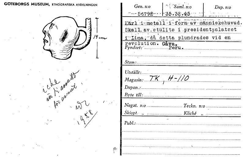 • GOTEBORGS MUSEUM, ETNOGRAFISKA AVDELNINGEN Gen. n:o `Sand n:o Dep. n:o 5679-2- 35.32.45 "' -i-form- av människohuvud. Skall_ av_ stuii ts _presidentpalatset i-Lima,- då detta plundrades vid en revolu... Visa hela