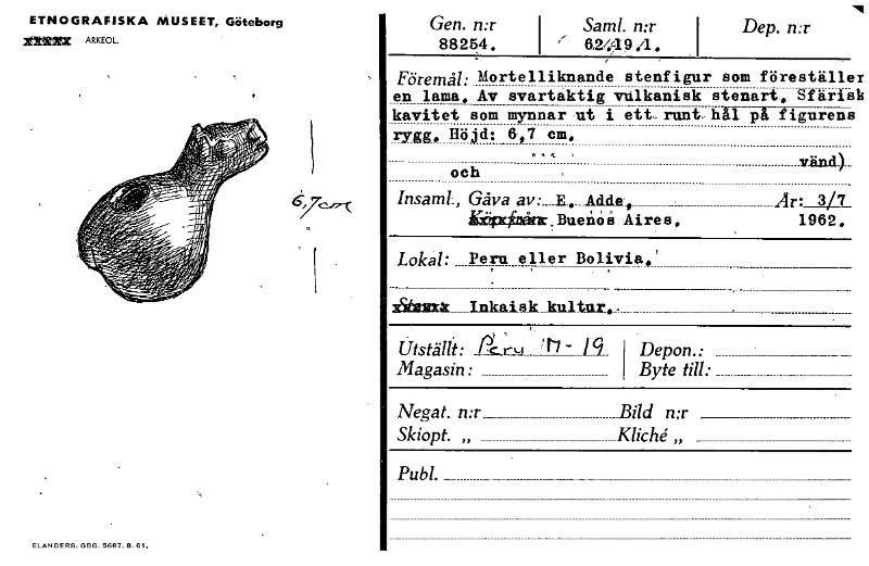 ETNOGRAFISKA MUSEET, Göteborg mo= ARKEOL 67C-17"( ELANDERS. GBG. 5687. B. 61. Gen. n:r 88254. Saml. n:r i '' 62(494. I Dep. n:r Föremål: Mortelliknande en lama. Av svartaktig stenfigur vulkanisk ut i ett-, runt, cm. I- som föreställE stenart.. SfarrE häl prfigurenE vänd)... Är: 3/7 kavitet som mynnar rygg. Höjd: 6.7 och Insaml:, Gåva av:__Adde: o 1~etir . Buenos Aires. 1962. Lokal: Peru eller Bolivia.' lärbinikk Inkalek_ kultur. . e., , Utställt: lk.ru 'el - 19 Byte till: Depon.: Magasin: Negat. n:r_ Skiopt. „ Bild n:r Kliché,, Publ. — [ocr]