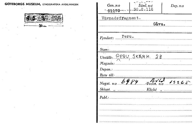 • GOTEBORGS MUSEUM, ETNOGRAFISKA AVDELNINGEN Gen.,n:o Sånt. n:ö —52.4 .112 Dep. n:o Vävnad.r;frag,inent . Gåva. Fyndort: Peru. Stam • Utställt: 9,ER U. 3 K gs . g Magasin: Depon.: Byte till: Negat. n... Visa hela