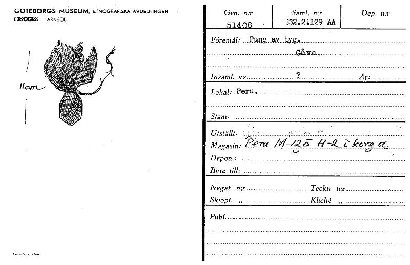 GOTEBORGS MUSEUM, ETNOGRAFISKA AVDELNINGEN EINOCMC ARKEOL. Ebtorders, Gby 'Gen. n:r 51408 - -Sam!. .n:r 332.21129 AA Dep. n:r Föremål: Pung av tyg., Gåv.a. Insaml. av: ? Är: Lokal: ?enl. Stam: . U...