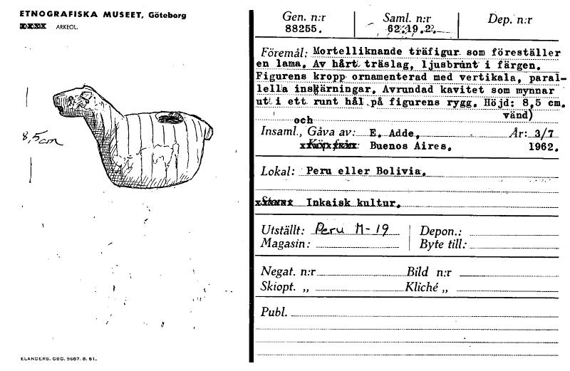 ETNOGRAFISKA MUSEET, Göteborg XX= ARKEOL. I • ELANDERS. GBG. 5637. 8. 61. Gen. n:r 88255. Saml. n:r , 921-,1.p..2;__ i Dep. n:r Föremål: Mortelliknande träfigur_ en lama. Av hårt, träslag, ljusbrint F...