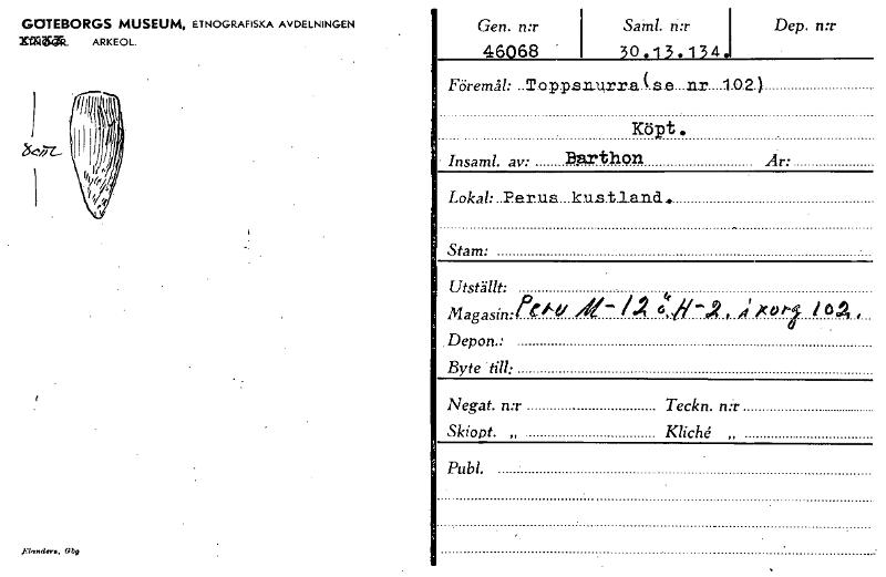 • GOTEBORGS MUSEUM, ETNOGRAFISKA AVDELNINGEN XfAM. ARKEOL. Gen. n:r 46068 • Sainl. ri:r 30.13.134. Dep. n :r Föremål: ..T.oppsn4nralse .nr 1024 Köpt . Insaml. av: B:arthon Ar: Lokal: ..Perua...ku.s.t.... Visa hela