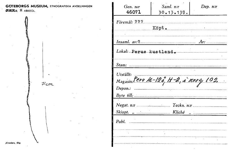 • GOTEBORGS MUSEUM, ETNOGRAFISKA AVDELNINGEN amstR. x ARKEOL. Gen. n-:r Saml. n:r 46071 30.13.137• Dep. n:r Föremål: .??? Köpt Insaml. av:? Ar: Lokal:. Perus ku,stland Stam: Utställt: Magas' in: it'‹§r... Visa hela