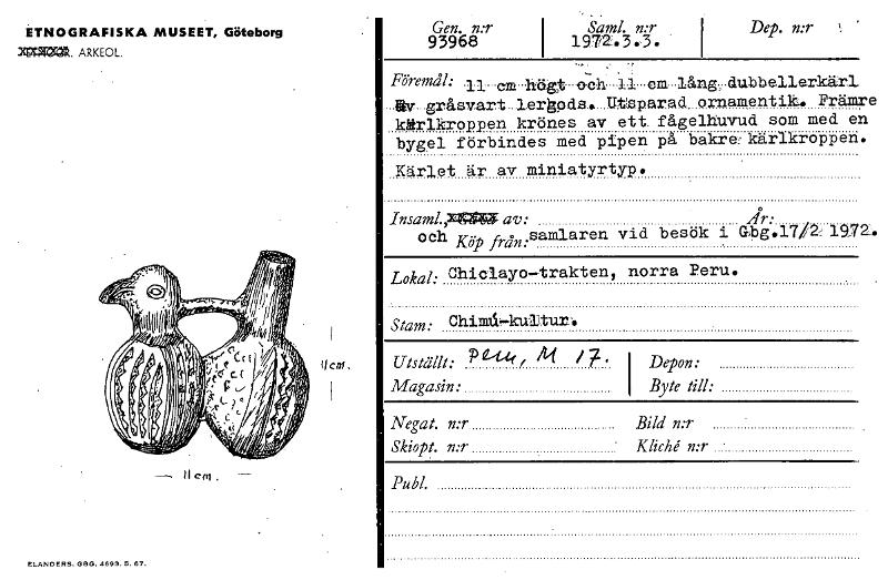 ETNOGRAFISKA MUSEET, Göteborg 2~. ARKEOL. -■ HCM. 93968 1 Saml. n:r 1972.3.3. I Dep. n:r ■ ' Gen. n:r Föremål: li cm hijact o-ch il cm. lång dubbellerkärl fiv gråsvart lerkods. Utspara(3. ornamentik. Främre kärlkroppen krönes av ett fågelhuvud som med en bygel förbindes med pipen på. bakre: kärlkroppen. Kärlet är av miniatyrtyp. Insaml.,nd.P..: av: Ar: och Köp från:samlaren vid besök i Gbg.17/2. 19,72. Lokal: Chiclayo—trakten, norra Peru. Stam: ChimtiAcultur Utställt: P "4 f 114 7. Depon: Magasin: I Byte till: Negat. n:r Bild n:r Skiopt. n:r • Klich'i n:r Publ. ELANDERS. GBG. 4693. 5. 67. [ocr]Stäng