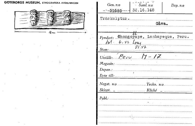 GOTEBORGS MUSEUM, ETNOGRAFISKA AVDELNINGEN Gen. n:o .Träs kulptia . Saml. n:o 32.16.14e Dep. n:o Gåva. Fyndort: Chongoyape, Lambayeque, Peru. V 6,, 3/1- 4144 Stam • ,- Utställt• Per u — /7 Magasin: Depon.: Byte till: Negat. n:o teckn. n:o Skiont. „ Kliché „ Publ [ocr]