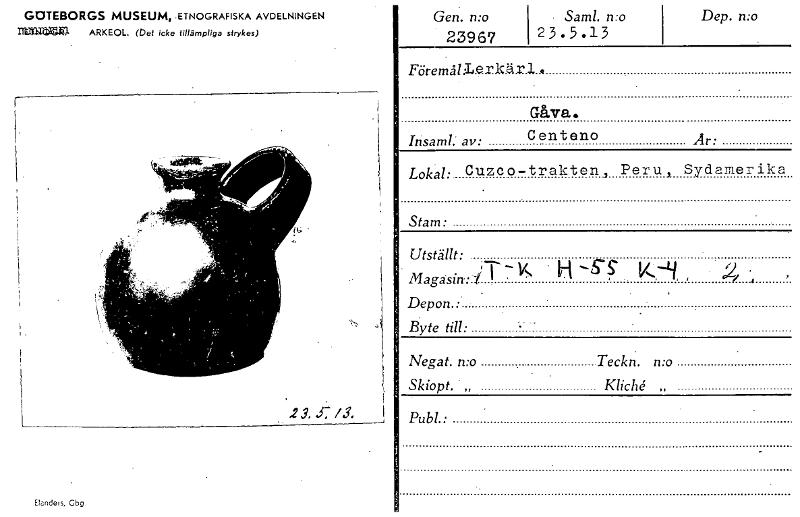 • GOTEBORGS MUSEUM, .ETNOGRAFISKA AVDELNINGEN ~kW ARKEOL. (Det icke tillämpliga strykas) Pondets, Gbg Gen. n:o 23967 - Saml. no 23.5.13 Dep. n:o F6remii/I.e.rk.ä.1.1 4 Gåva. Irisaml.' av: Centeno Är: ... Visa hela