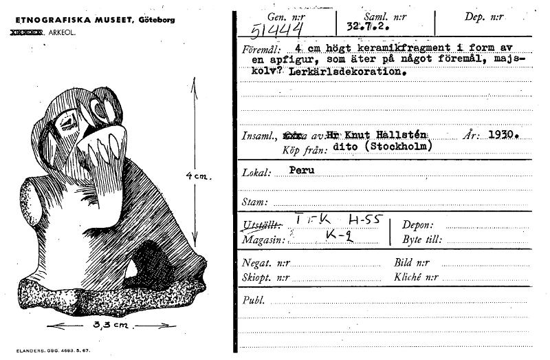 • ETNOGRAFISKA MUSEET, Göteborg MEX. ARKEOL. SamL n:r Gen. n:r 347.2. Dep. n:r Föremål: 4;cm högt keramikfragment i. form av en apfigur, som äter på något föremål, maje- kolVerkärlsdekoration. Insaml.,... Visa hela