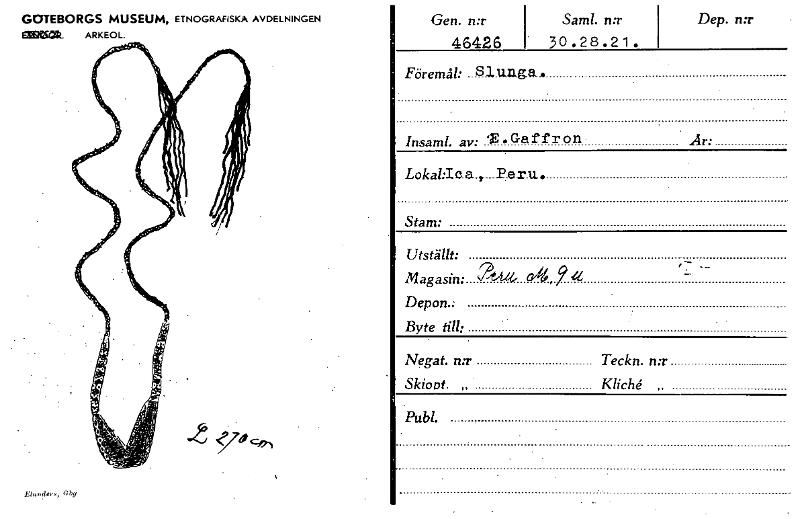 GOTEBORGS MUSEUM, ETNOGRAFISKA AVDELNINGEN 0112~. ARKEOL. El< nde-s, (ag Gen. n:r • 46426 Samt. n:r i 30.28.21. Dep. n:r • Föremål: Slunga. Insaml. av: 'E. Ga f f r o n År: Lokablea.,...P.e.r.u, Stam...