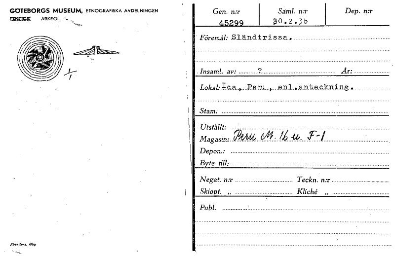 GOTEBORGS MUSEUM, ETNOGRAFISKA AVDELNINGEN ED3CILIC ARKEOL. Gen. n:r 45299 Saml. n:r 30 .2. 31D Dep. n:r Föremål: .Sländtris.s.a.. Insaml. av: År: Lokal:..c.a..,....P.e.m...,....e.n1....antre.ckning...