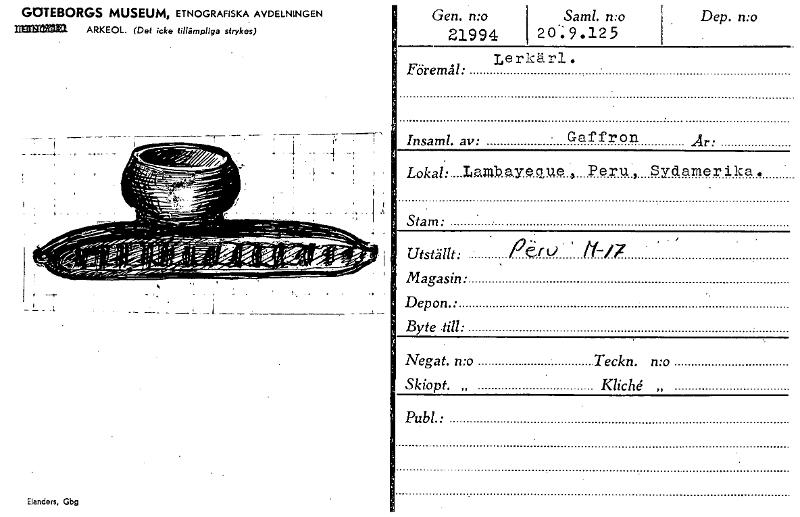 • GOTEBORGS MUSEUM, ETNOGRAFISKA AVDELNINGEN Mannian ARKEOL. (Del icke tillämpliga sfrykes) Elanders, Gbg Gen. n:o 21994 Sarnl. n:o 20-.9.125 Dep. n:o Lerkärl. Föremål: Insaml. av: Gaffron Är: Lokal; .... Visa hela