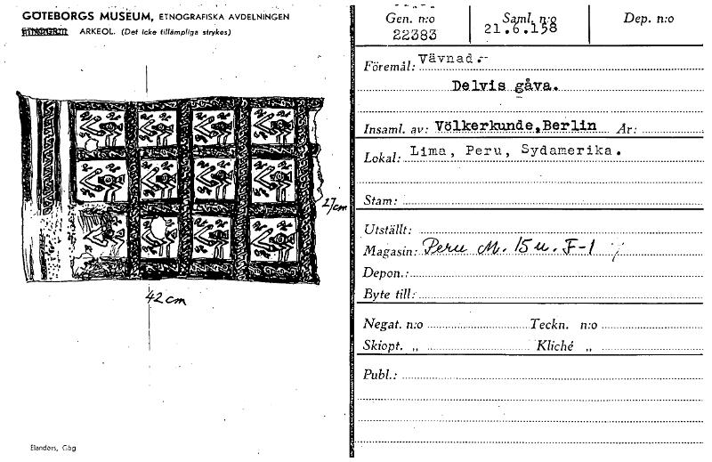 • GOTEBORGS MUSEUM, ETNOGRAFISKA AVDELNINGEN ~Il ARKEOL (Det icke tillämpliga strykes) Elanders, Gbg Gen. no 22383 Sam1 ity g 21.6. Dep. n:o Föremål: Vävnad :- Delvis.. gåva.. _. hisaml. av: Irö lke rim... Visa hela