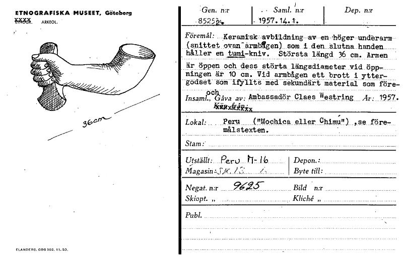 ETNOGRAFISKA MUSEET, Göteborg ARKEOL ELANDERS. 000 502. 1. 53. Gen. mr I •8525-åy. . .. Sam!. 'n:r [1957.14.1. • Dep. mr I - Föremål:(snittet ovan-armbggen) Som_i_den.:slutna_handen håller en-kniv. Största längd 36 cm. Armen ' är öppen och dess störta längsdiameter vid...öpp- ningen är 10 cm. Vid armbågen ett brott i ytter- godset som ifyllts med sekundärt material som före. Insarroch d, G åva av: Ambassadör Claes Westring. Är: 1957 kikillicx , Lokal: Peru ("Mochica eller Chimun) ,se före- målstexten. Stam:' : Utställt:.... i'.?e..ro h- Ib • • Magasin:..S,Y. ÅT': .7. Depon.: Byte till: Negat. n:r 92S.. n:r Skiopt. „ Kliché Publ. ., ' - [ocr]Stäng
