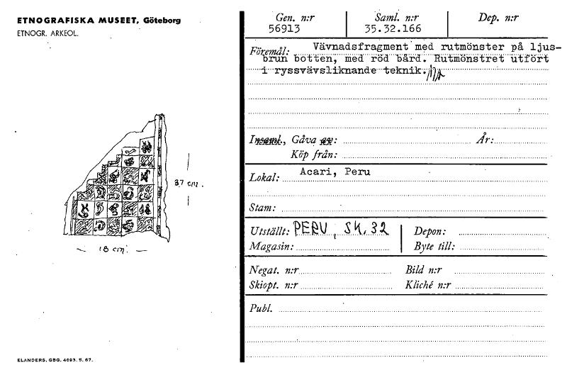 • Dep. n:r ETNOGRAFISKA MUSEET, Göteborg ETNOGR. ARKEOL. 56913 n:rSaml. n:r35.32.166 ctiz Föremål Vävnadsfragment med rutmönster på ljus— : brun botten, med röd 'bård. rhitmönstret utfört i. ryssvävsli... Visa hela