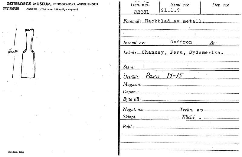 • GOTEBORGS MUSEUM, ETNOGRAFISKA AVDELNINGEN n~. ARKEOL. (Det icke tillämpliga strykes) 16ag Elanders, Gbg Gen. n:o. 22081 Saml. mo 21.1. 9 Dep. n:o Föremål: ...1-1a.c.khla.d....av...m.et.a11. . . Insam... Visa hela