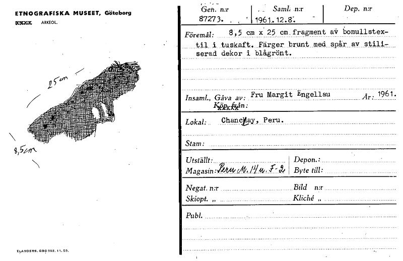 _ Gen. n:r I _ Saml: .n:r 87273. . , I 1961,12.8: Dep. n:r ETNOGRAFISKA MUSEET, Göteborg euxxx ARKEOL. ELANDERS. GBG 502. Il. 53. Ar: 1961. Insaml., Gåva av: Fru Margit Engellau KÄPxiki n Lokal: Chan...