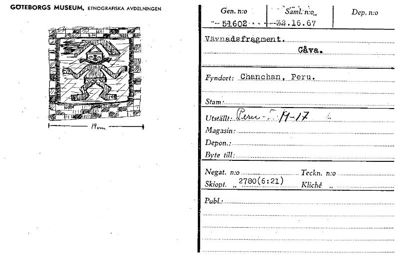 • GOTEBORGS MUSEUM, ETNOGRAFISKA AVDELNINGEN Gen. n:o . --- 51602 • Dep. n:o ..Väir.ntidsfrg.g. ment.. Gåva. Fyndort: Chanchan , Peru. Stam • Utställt Magasin: Depon.: Byte till: Negat. n:o Teckn. mo ... Visa hela