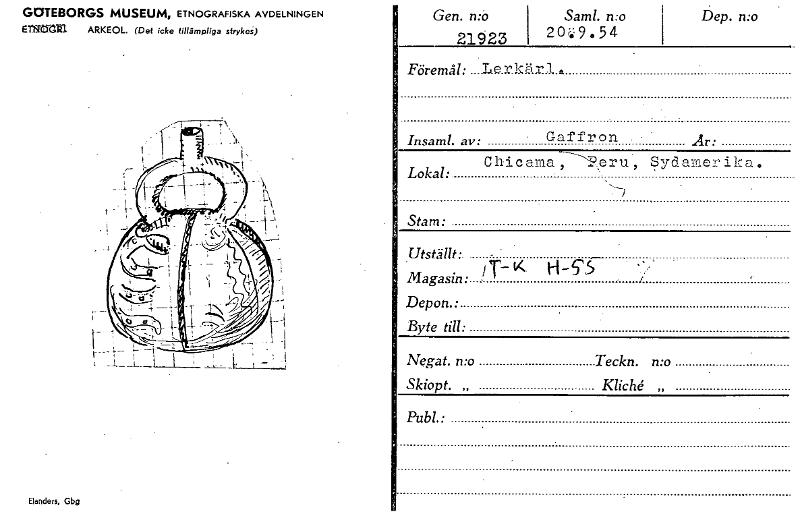 • GOTEBORGS MUSEUM, ETNOGRAFISKA AVDELNINGEN ETIMitla ARKEOL. (Det icke tillämpliga strykes) Elanders, Gbg Gen. n:o 21923 Sam!. n:o 200.54 Dep. n:o Insaml. av: Föremål: • Gaffron. . • . År: Lokal:. Stam... Visa hela