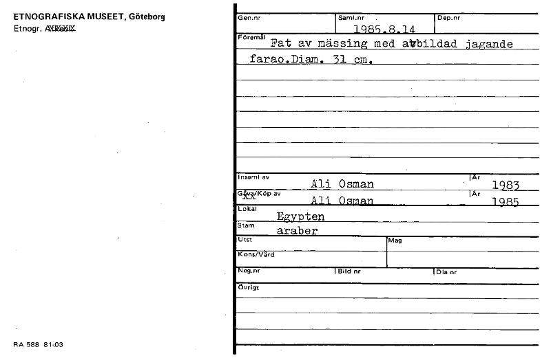 • ETNOGRAFISKA MUSEET, Göteborg Et nogr. AYMäIK RA 588 81,03 Gen.nr Saml.nr . 1q85.8.14 Dep.nr Föremål Fat av mässing med atrbildad jagande farao.Diam. 31 am. insamlav ALL Osman lÄr 1983 grt/Köp av Ali ... Visa hela