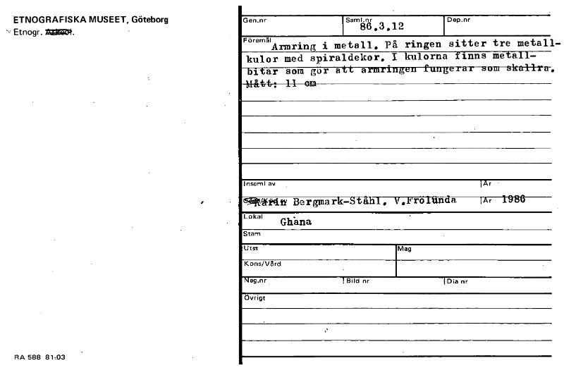 • ETNOGRAFISKA MUSEET, Göteborg -- Et nogr. RA 588 81,D3 Gen.nr Saml.nr 86.3.12 I Dep.nr Föremm Armring i metall. På ringen sitter tre metal: kulor med spiraldekor. I kulorna finns metall- n _ungexai bo... Visa hela