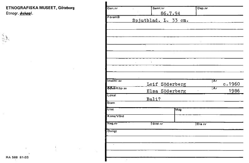 • ETNOGRAFISKA MUSEET, Göteborg Etnogr.36/(1§,es41. RA 588 81,03 Gen.nr Saml:nr 86.7.94 Dep.nr Föremål Spjutblad. L. 33 cm. • Insaml av Leif Söderberg lAr c.1960 -/Köp av Elsa Söderberg IÅr 1986 Lokal B... Visa hela