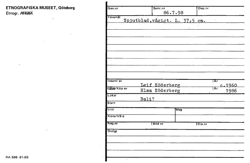 • ETNOGRAFISKA MUSEET, Göteborg Etnogr. AflIkibX RA 588 81-..03 Gen.nr Saml.nr 86.7.98 Dep.nr Föremål Spjutblad,vågigt. L. 375 cm. Insaml av i Ar Leif Söderberg p.1960 Gg/Köp av 'År Elsa Söderberg 1986 ... Visa hela