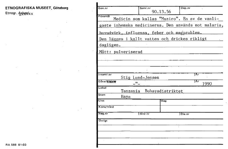 • ETNOGRAFISKA MUSEET, Göteborg Etnogr. 451<iNkx RA 588 81,03 Gen.nr Saml.nr 90.13.56 Dep.nr Föremål Medicin som kallas "Muziro" En av de vanli- gaste inhemska medicinerna. Den används mot malaria, huvu... Visa hela