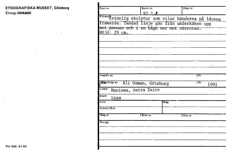 • ETNOGRAFISKA MUSEET, Göteborg Et nogr~ RA 588 81-..03 Gen.nr Sami.nr 77 P Dep.nr Fömm vinnlig skulptur som vilar händerna på lårens Iramsida. Tandad linje går från underkäken upp - 1 Höjd: 29 cm. Insa... Visa hela