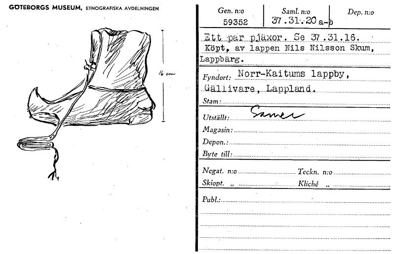 • GOTEBORGS MUSEUM, ETNOGRAFISKA AVDELNINGEN /6 Gen. mo Samt. n:o13 Dep. n:o 59352 37.31.20a_ Ib -par pjäxor. Se 37.31.16. Köpt, av lappen Nils Nilsson Skum, Lappbarg. Fyndort: Norr-Kaitums lappby, Gäl... Visa hela