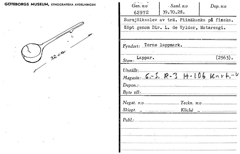 • GOTEBORGS MUSEUM, ETNOGRAFISKA AVDELNINGEN — . - Gen. n:o 62972 - Sam!. n:o 39.70.28. Dep. n:o Surmjölksslev av trä. Piimäkanka på finska. Köpt genom Dir. L. de Vylder, Matarengi. Fyndort: Torne lapp... Visa hela