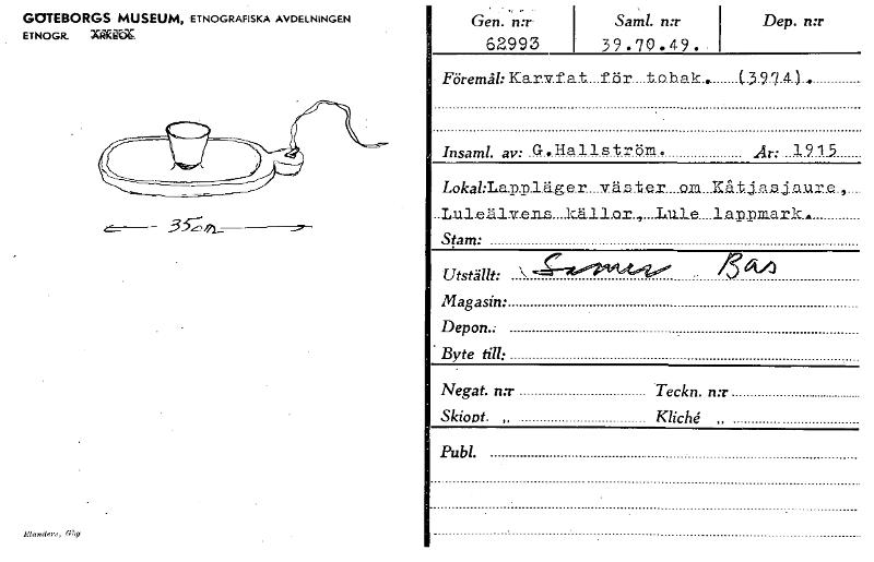 GOTEBORGS MUSEUM, ETNOGRAFISKA AVDELNINGEN ETNOGR. Xl&ga. fficendens,Gbg , - Gen. .: n:r 62993 Saml. n:r 39.70.49. Dep. n:r Föremål: Kar.v.f. at... för tobak.. C.3.97 4 L.,, Insaml. av: G.Hallström. År: 1915 Lokablia.p.p.l.ä.g.er vä..z.l.t.e.r....m...n.t.j...j..aux..e., ..liu1.e.ä.13.7...en.s källor., ..L.u.le. .1.a.p.maark.. Stam: Utställt: Magasin: Depon.. " Byte till: Negat. n:r Teckn. n:r Skioot. „ Kliché. „ Publ. [ocr]