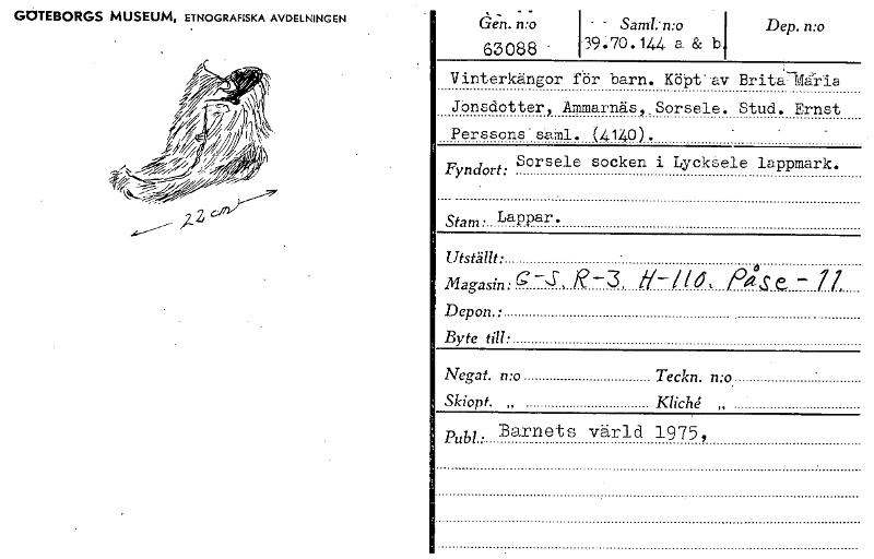 GÖTEBORGS MUSEUM, ETNOGRAFISKA AVDELNINGEN - - Gen. wo 63088 - Sand.. n:o 1 Dep. n:o 39.70.144 a & Vinterkängor för barn. Köpt av Brita7-1gria JOnsdotter, Ammarnäs,,Sorsele. Stud. Ernst Sorsele socken i Lycksele lappmark. Fyndort: Starn • l'appar • Utställt: Magasin: , R-3, kl-//0, /s ..e - 71 Depon.: Byte till: Negat. n:o Teckn. Skiont. Kliché pubi Barnets värld 1975, Perssons'saml. (4140). [ocr]