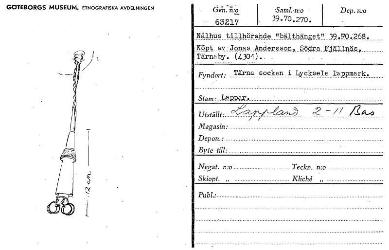 • 63217 GOTEBORGS MUSEUM, ETNOGRAFISKA AVDELNINGEN Saml..,n:o • 39.70.270. Dep. n:o Nålhus tillhörande nälthängetn-39.70;268. Köpt av-Jonas Andersson, Södra Fjälinäs, Tärnabv. (4301)._ _ Fyndort: Tärn... Visa hela