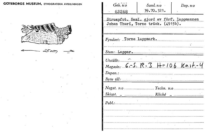 • GOTEBORGS MUSEUM, ETNOGRAFISKA AVDELNINGEN Sam1.•n:o 63268 39.70.321. Dep. n:o .gj ord 'av förf-. lappmannen Johan Thuri , -Torne träsk. (4915b). Fyndort: Torne lappmark. Stam:... Lappar. Utställt• ... Visa hela